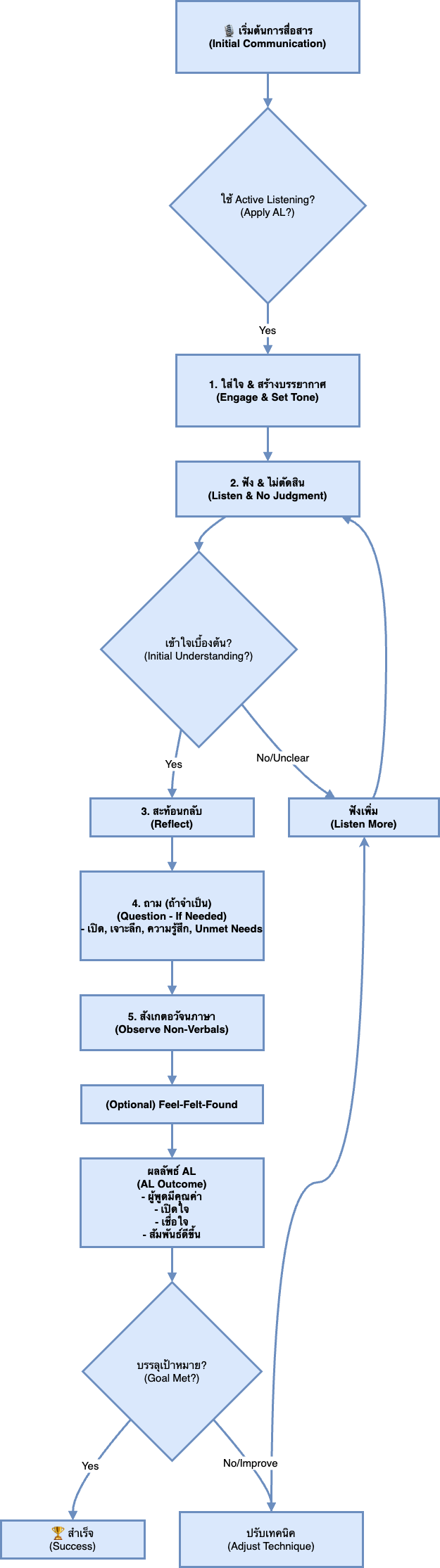 เห็นไหมครับ พี่ปุ๊กไม่ได้แก้ตัว ไม่ได้โต้แย้ง แต่ “สะท้อนความรู้สึก” ของอาจารย์ท่านนั้นกลับไป ทำให้อาจารย์รู้สึกว่ามีคนเข้าใจความโกรธของเขา และเริ่มเล่าเหตุการณ์ทั้งหมดออกมา เมื่ออาจารย์ได้ระบายและรู้สึกว่ามีคนรับฟังอย่างแท้จริง ความโกรธก็ค่อยๆ ลดลง จนในที่สุดก็สามารถหาทางออกร่วมกันได้ นี่คือตัวอย่างที่ชัดเจนว่า Active Listening สามารถเปลี่ยนวิกฤตให้เป็นโอกาสได้อย่างไร