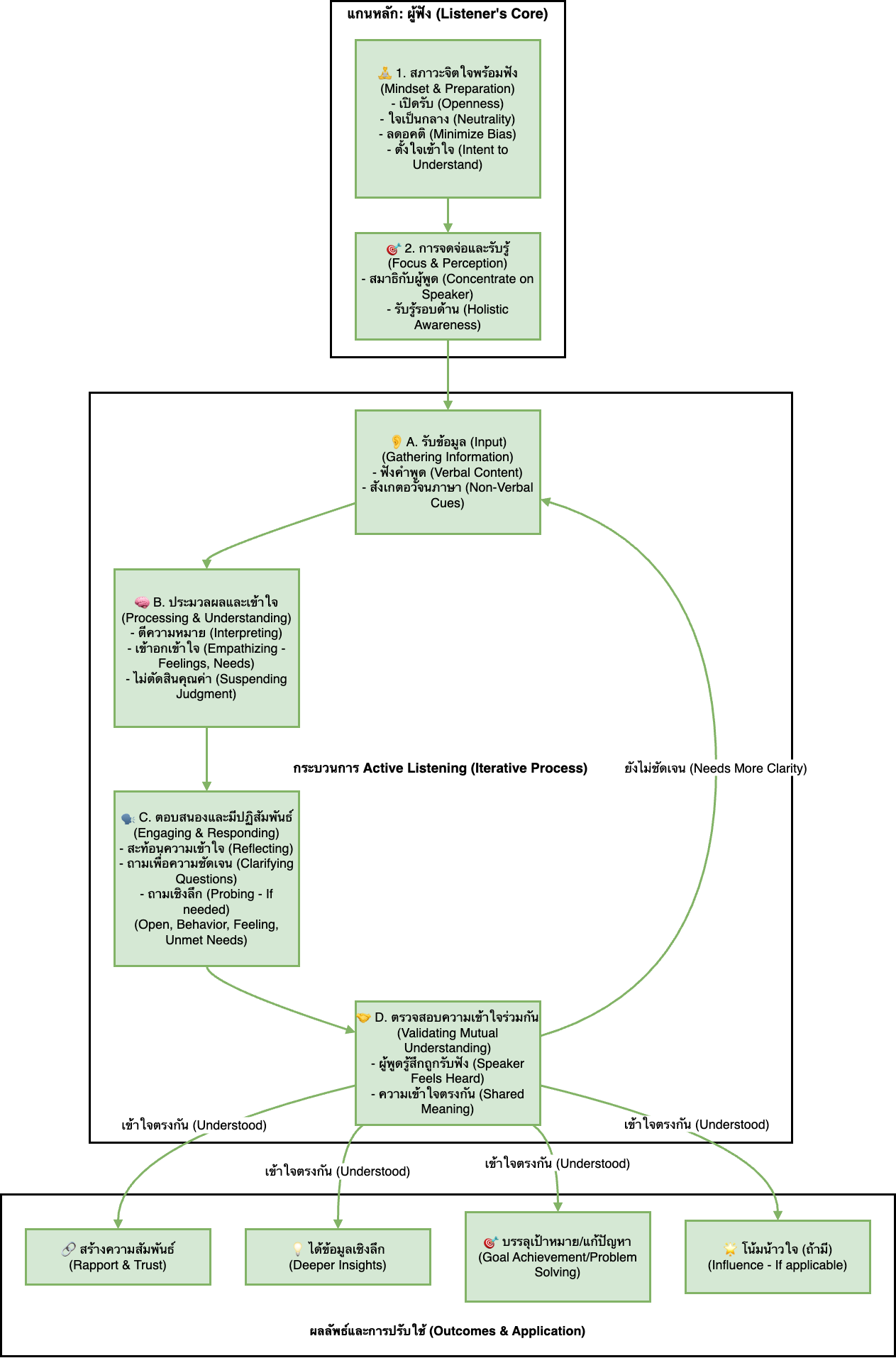นี่คือจุดสำคัญเลยครับ! สิ่งที่คนพูดออกมาเป็นคำพูด (Verbal) อาจเป็นแค่ยอดภูเขาน้ำแข็ง แต่ความรู้สึก (Feelings) ความคิด (Thoughts) และความต้องการที่แท้จริง (Underlying Needs) ต่างหากที่อยู่ใต้น้ำ ซึ่งการฟังอย่างตั้งใจจะช่วยให้เราดำดิ่งลงไปค้นพบสิ่งเหล่านี้ได้
